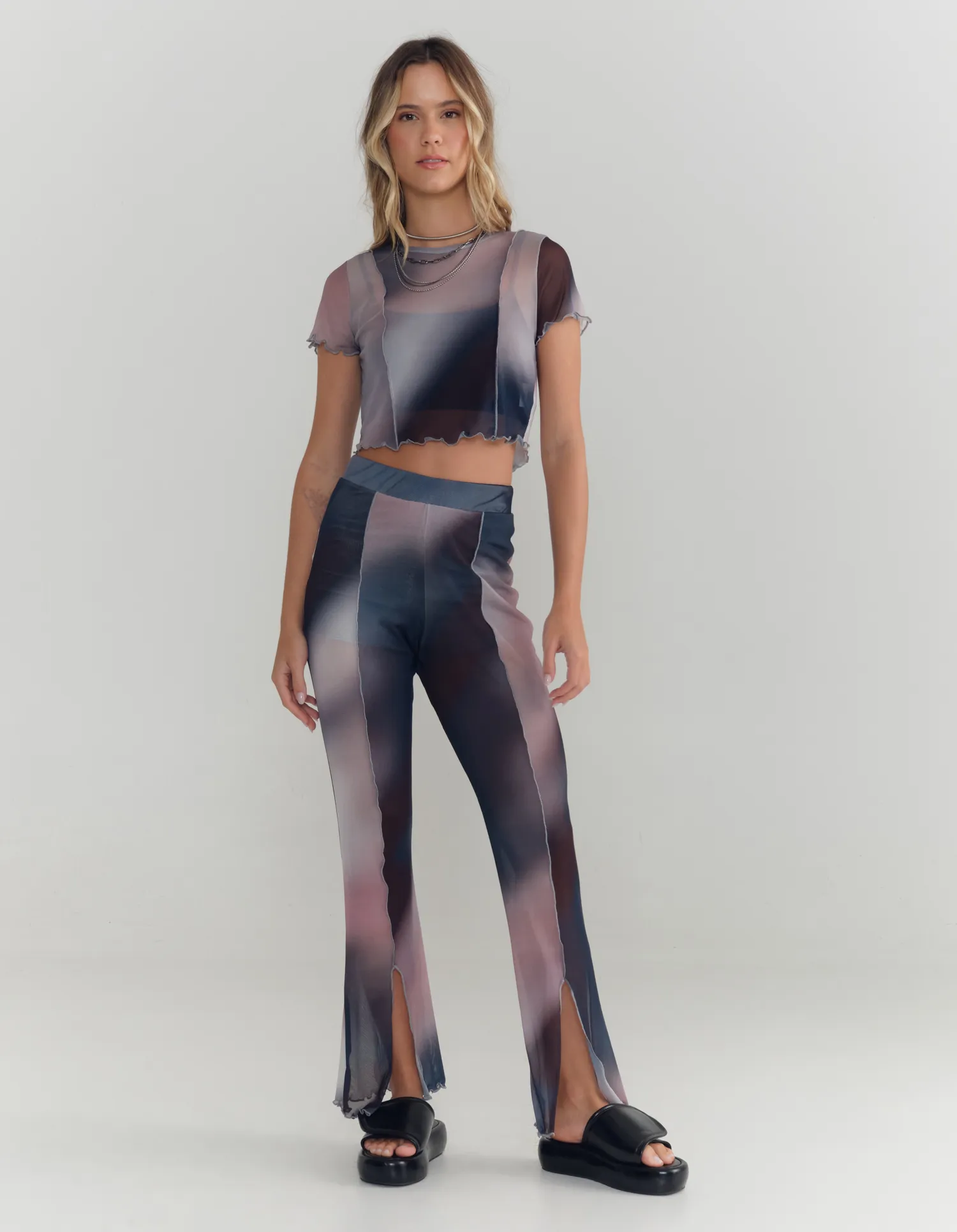 Calça Recorte Tule Estampada Blur Azul - Azul