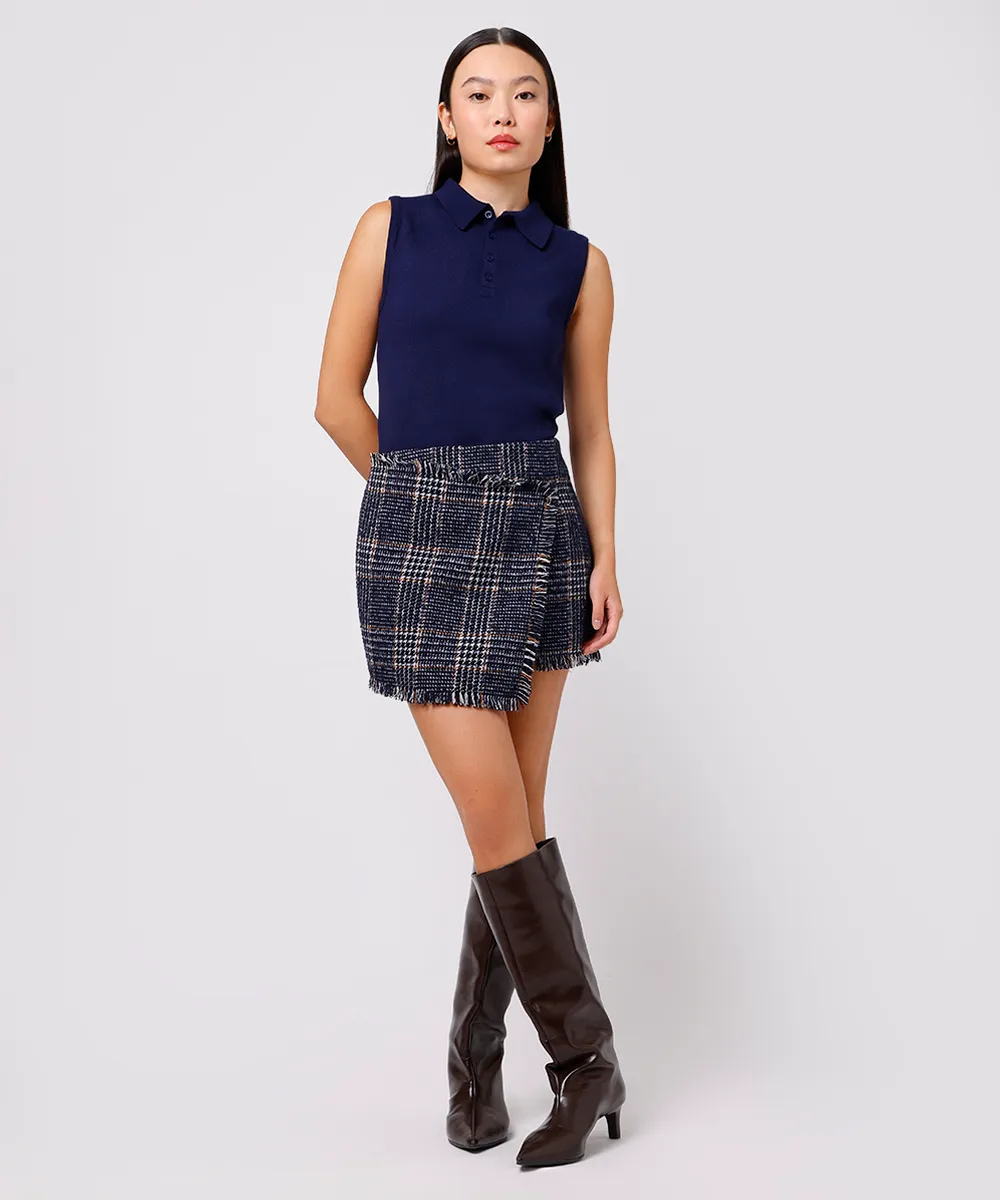 saia curta feminina de tweed com lã xadrez mindset azul