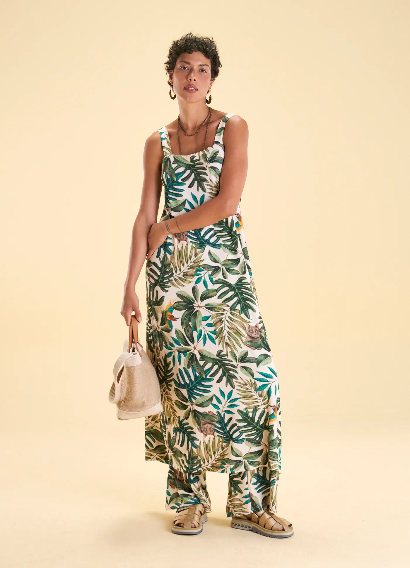 Vestido alça malha estampado jardim tropical off white