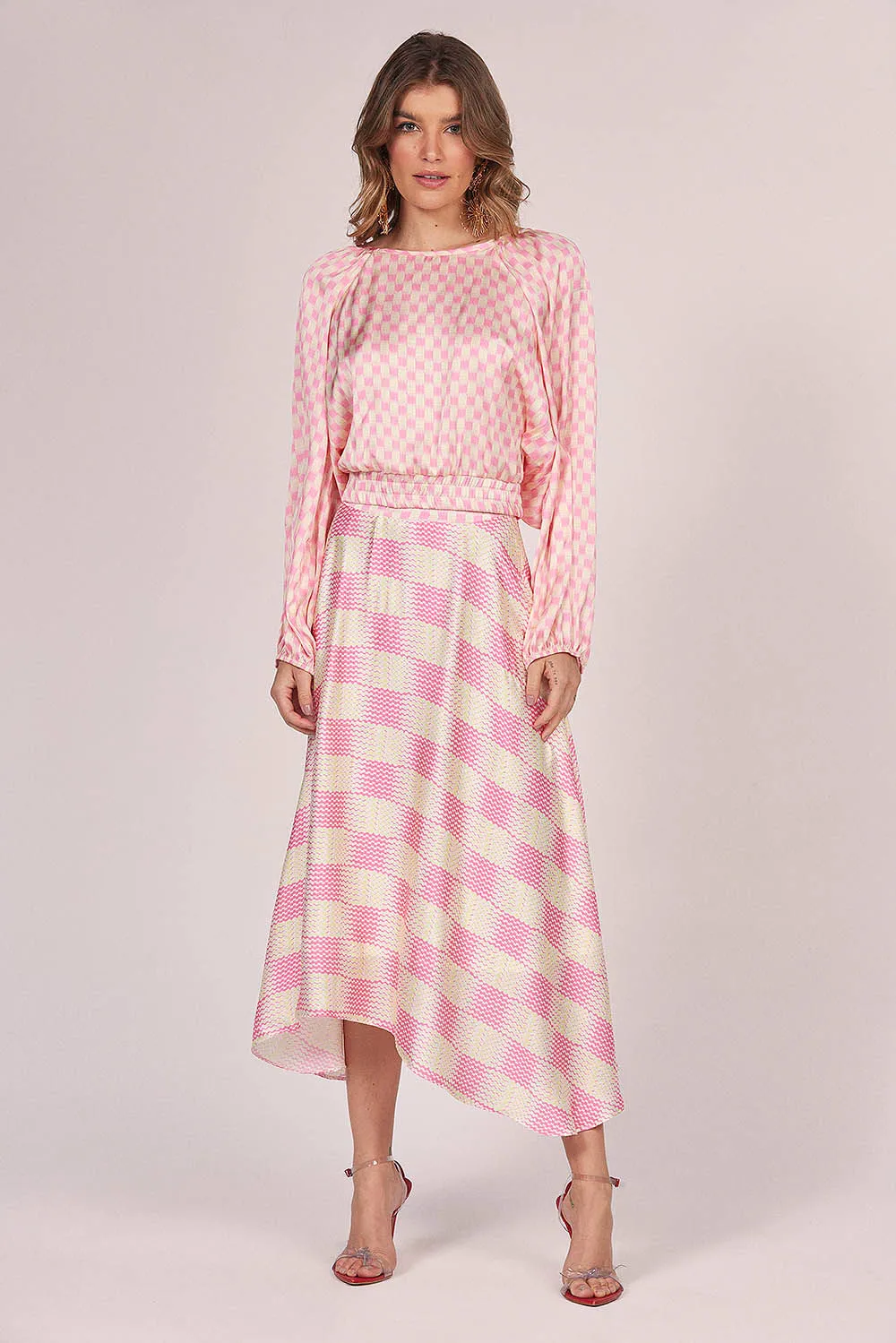 Saia Midi Assimétrica Estampa Xadrez Smk Rosa Médio