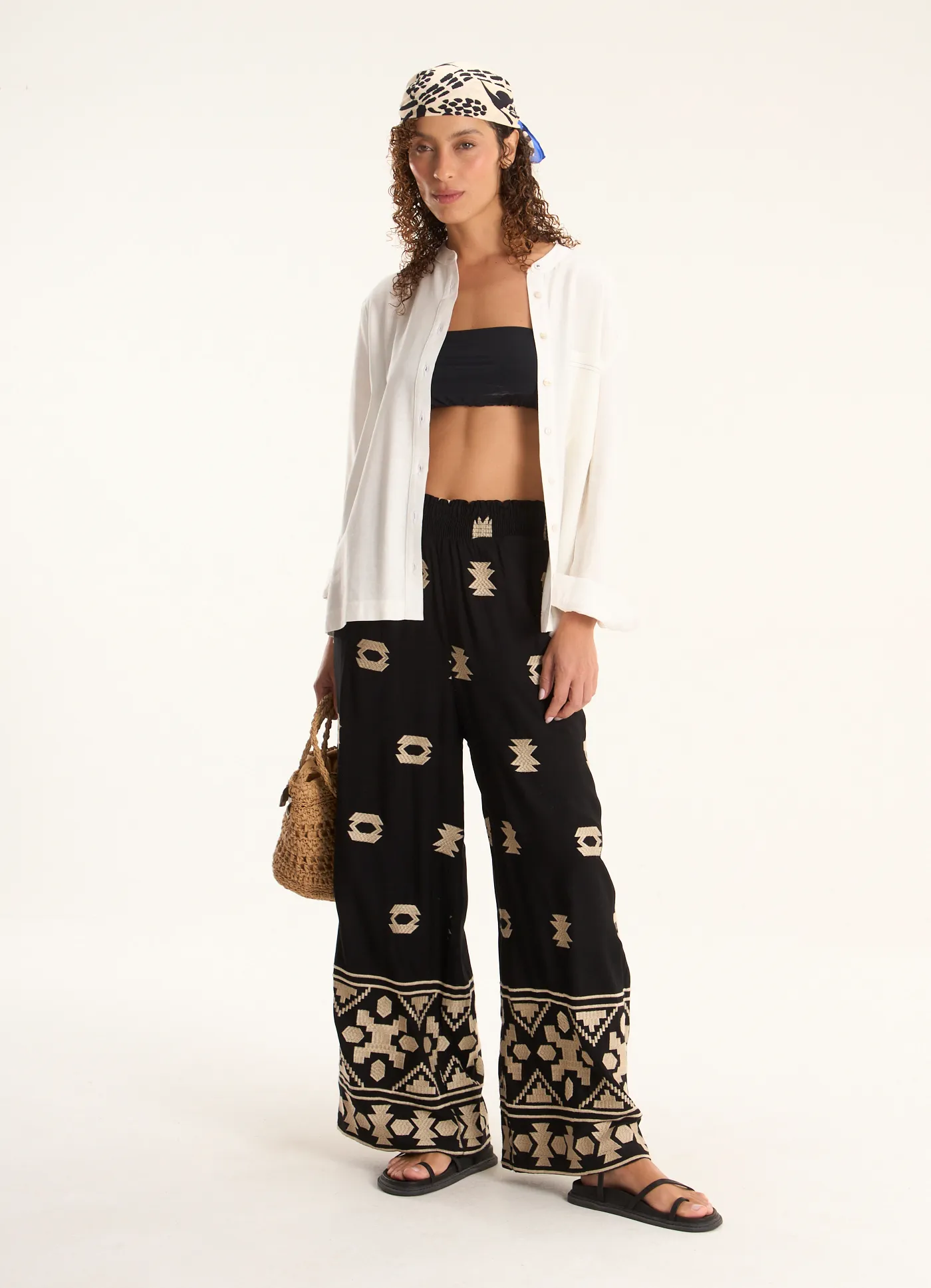 Calça viscose bordado símbolos