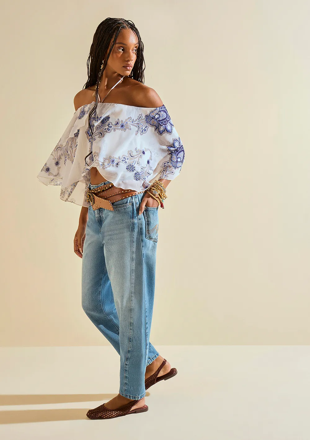 Blusa Morena Rosa Solta Ombro A Ombro Manga Longa Padrão Azul