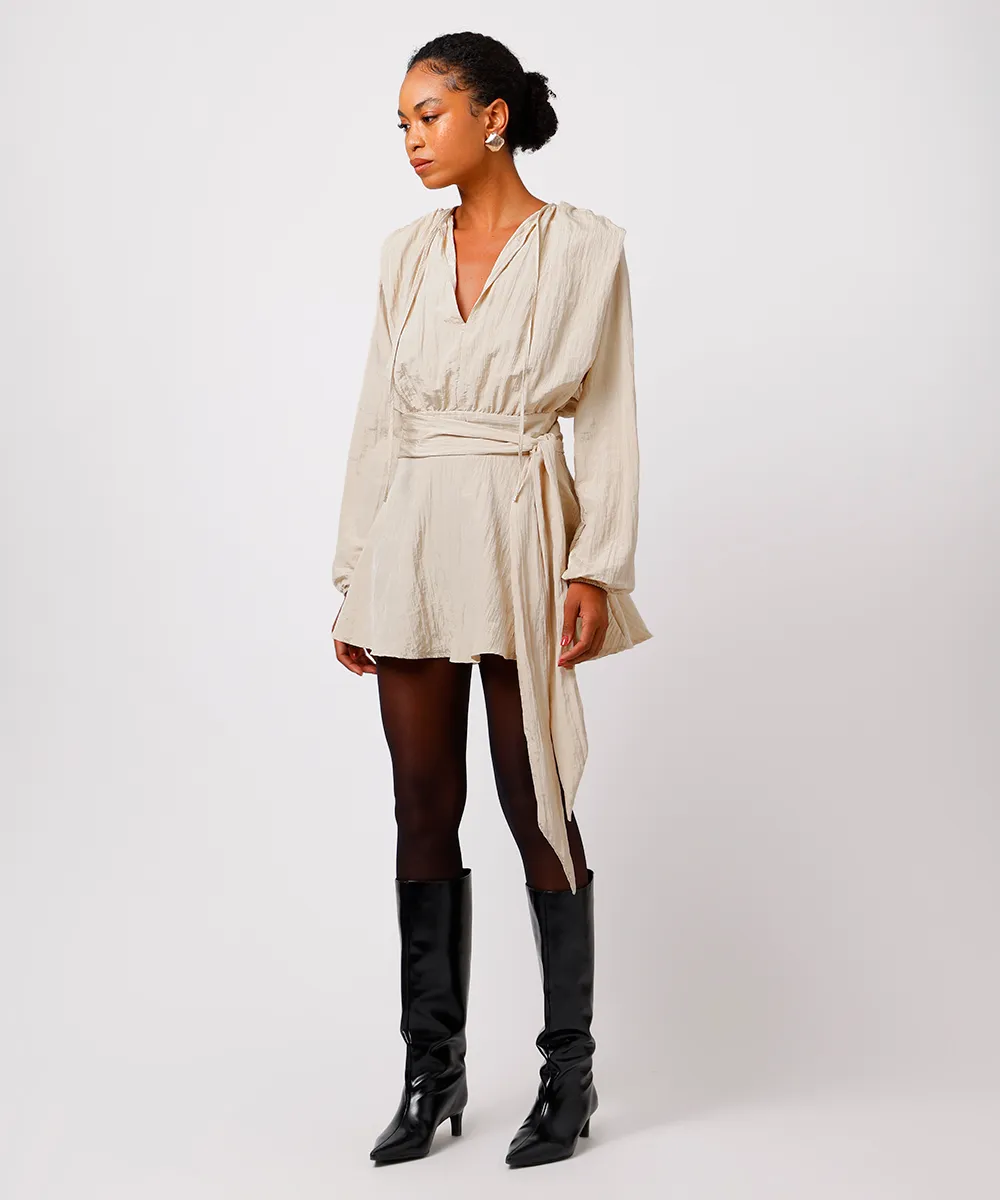 vestido curto feminino acetinado com faixa texturizado mindset bege