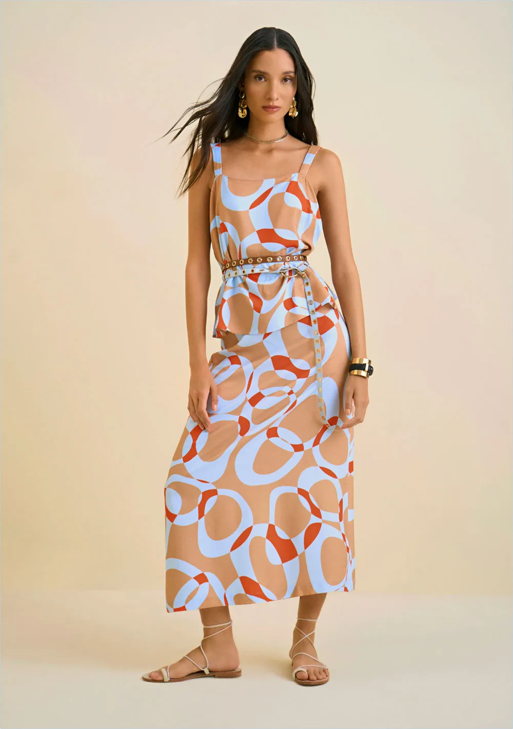 Saia Morena Rosa Midi Clochard Com Faixa Bege
